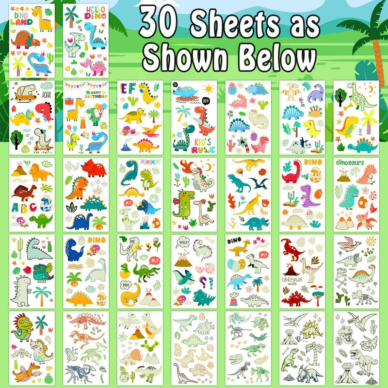 30 sheets (350 different styles) luminous kids dinosaur tattoos stickers for kids, children, toddlers.