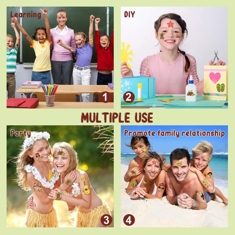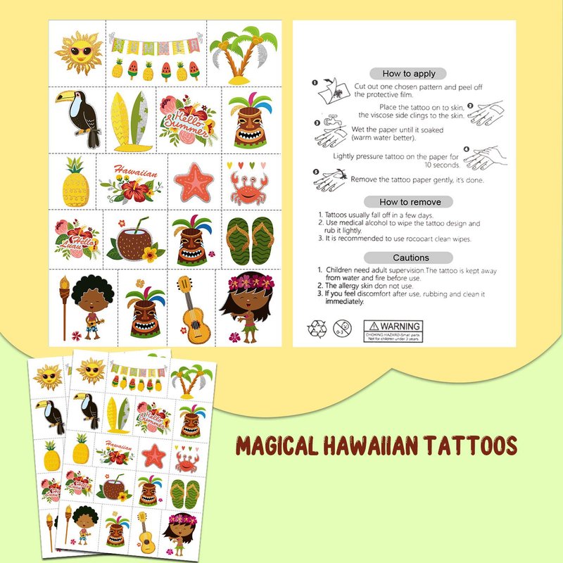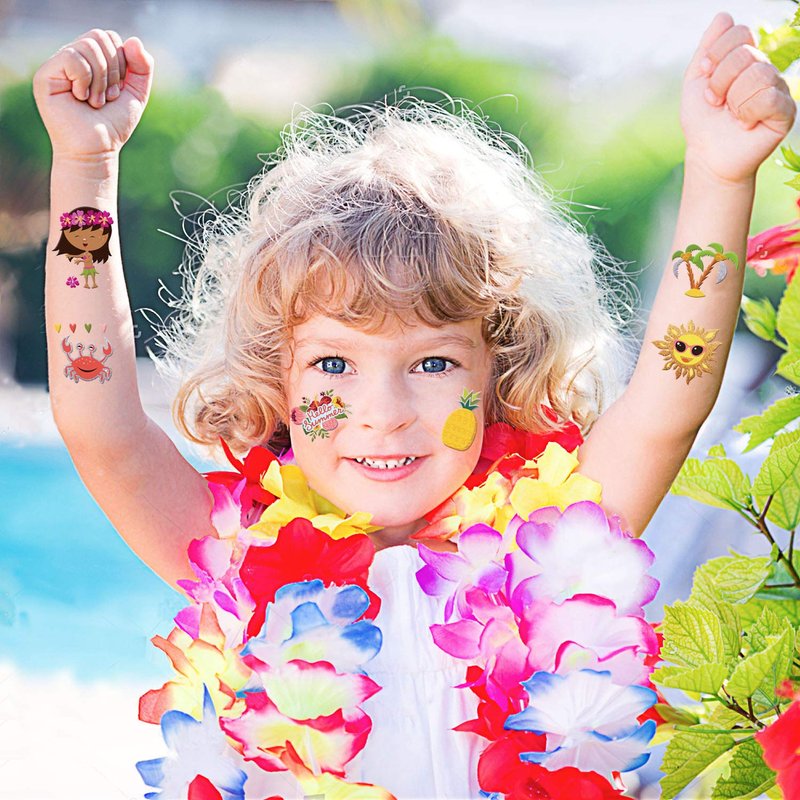 - 【Applicable Place】The temporary tattoos are perfect for Hawaiian luau theme party supplies, favors, decorations, birthday party, summer pool party and party bags. In addition, you can also put the tattoo on your face, arm, hands and legs, which will add the fun of Hawaiian themed birthday parties.