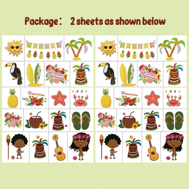 - 【Glitter Hawaiian Theme】There are different elements in the hawaiian theme temporary tattoos. Such as hawaiian, pineapple,sun, flower, woodpecker, starfish, crab, coconut, coconut tree, guitar and so on. They are all durable and colorful! The metallic gold + metallic silver tattoos make you shine in the party!