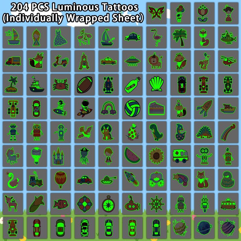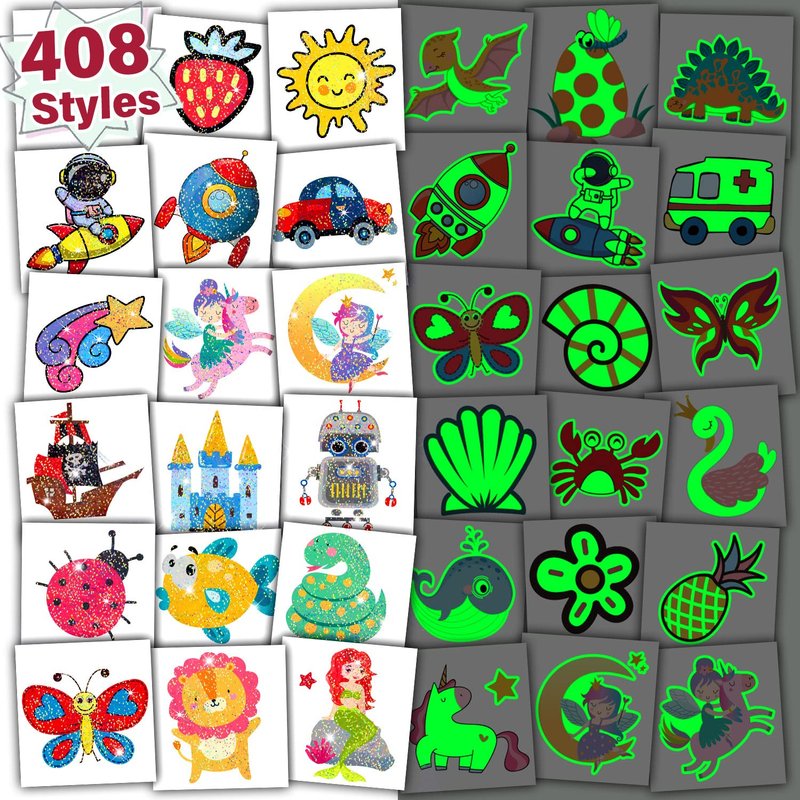 - 【408 Mixed Styles Kids Temporary Tattoos】Mix and match of two different styles! 204 PCS Glitter style will make you shine in the day. And 204 PCS Luminous style will make you unique and glow at night. A set of tattoos can make you happy all day! Are you looking for a unique party supplies for kids? Partywind tattoos is a perfect choice!