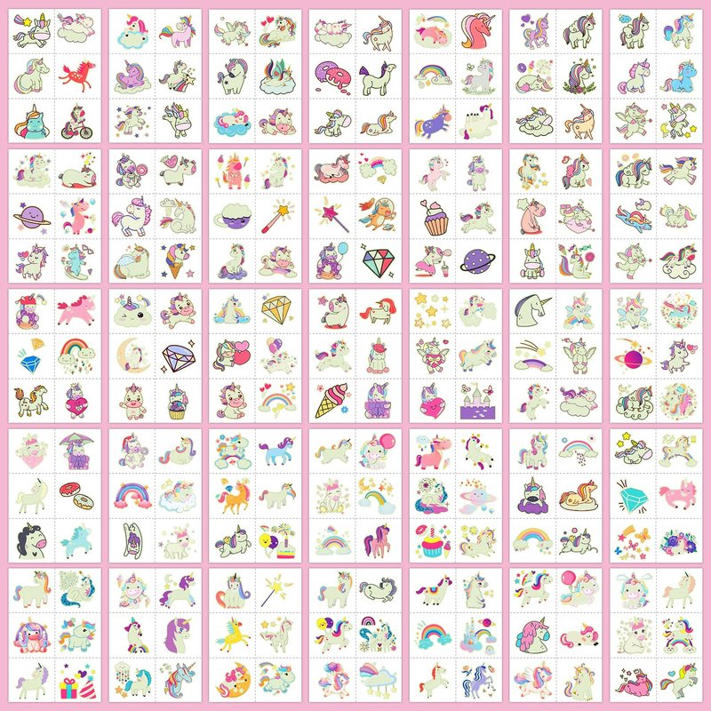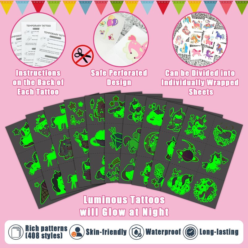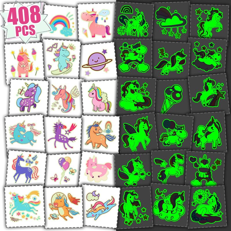 - 【Exquisite Designs & No Duplicates】408 Luminous fake tattoos (68 sheets) designed by Partywind, incorporating the popular elements for little girls. No repeating patterns, good choice as goodie bag stuffers to give your kids and guest a big surprise! Partywind temp tattoos undergo rigorous party testing, the fake tattoos will last all day or more.