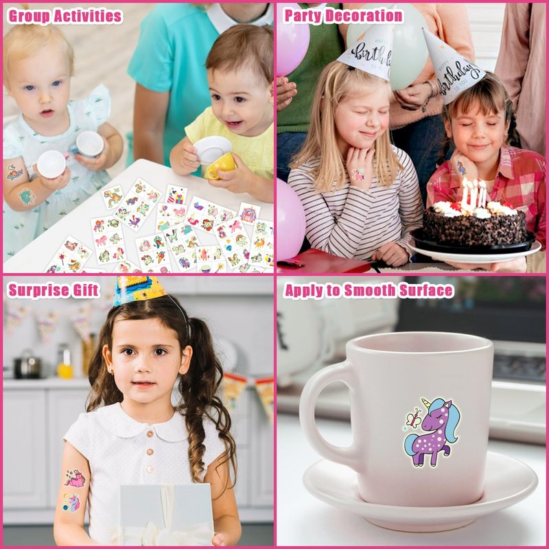 - 【Decorate Your Party】These tattoos stickers are suitable for girls party supplies, party favors, birthday party decorations, goodie bag fillers, kids stocking stuffers, games, toys, decor, prizes and so on. You can also apply them on some smooth objects, such as glass, tile, water bottle, plastic, phone case and so on.