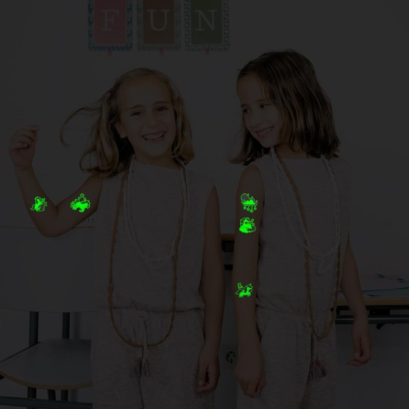 - 【Easy to Get Fun】Choose the pattern you like, and then face down on skin, wet the temp tattoo with water and wait for 10 seconds. Then gently tear off the white surface. You will get a cute kids tattoo! TIPS: Luminous tattoos need to be activated under light for a few minutes, which can make them more luminous in the dark.