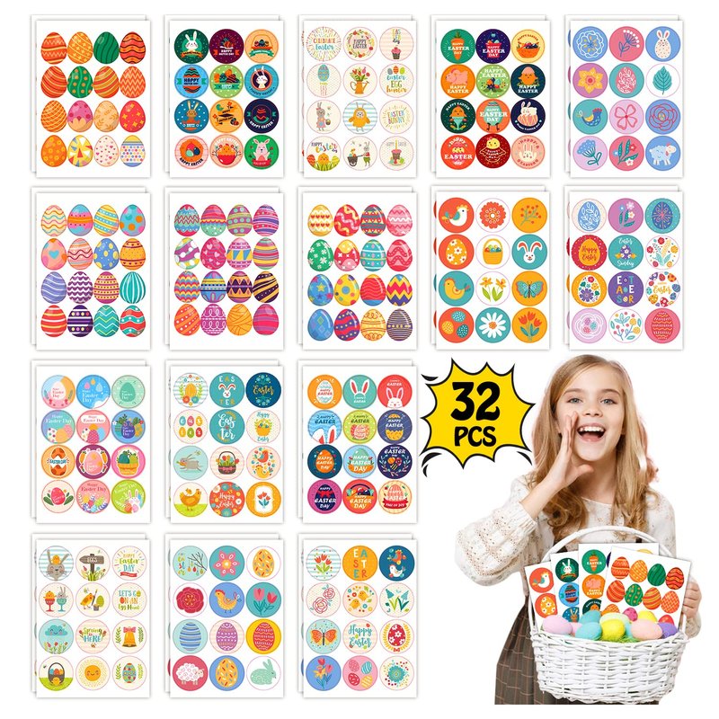 - Easter Stickers for Kids: Package includes 16 styles, 2 sheets of each style (416 PCS, 32 sheets in total). Super cute Easter designs includes various creative patterns with bright colors. Cute elements such as Easter Eggs, Basket, Chick, Rabbits, Flowers and other elements that kids will love. These stickers will bring you joy at Easter day!
