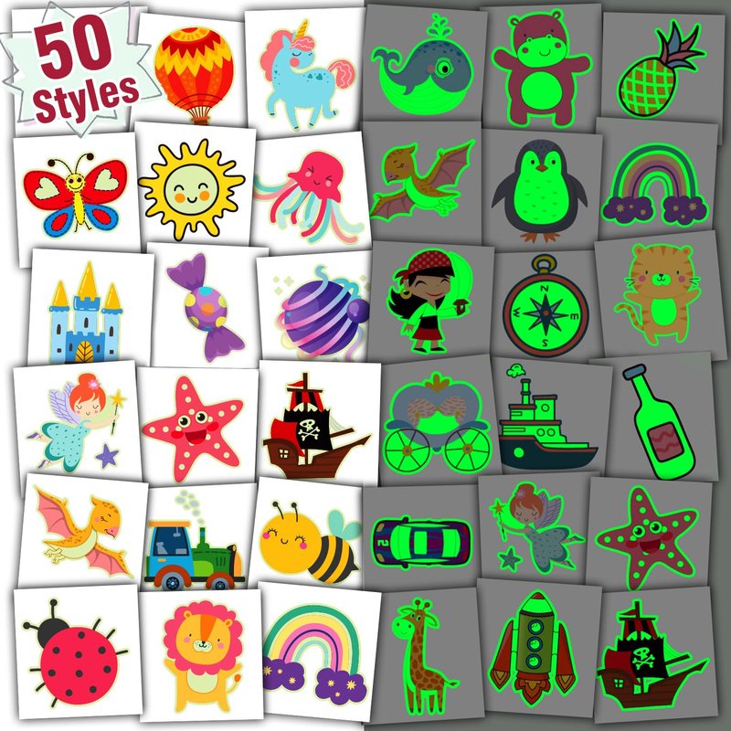 - 【Great Value Luminous Temporary Tattoos for Kids】50 Styles new luminous style will make you unique and glow at night. Cute elements include animals, dinosaur, mermaid, space, robot, cars, etc. Suitable for boys, girls, kids, children, toddler, baby. We can offer you the most stickers at a favorable price!