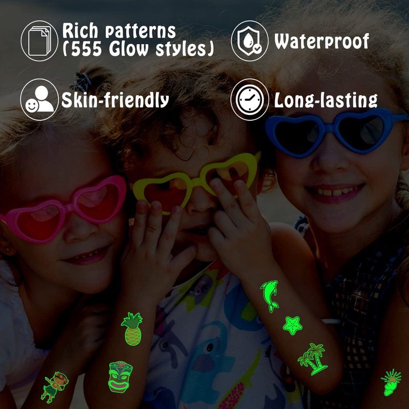 - 【Exclusive Designs & No Duplicates】555 Glow luau tattoos designed exclusively by Partywind, incorporating the most popular Hawaiian elements for kids. No repeating patterns and perfect choice as Hawaiian party supplies or gifts to give your kids and guest a big surprise!