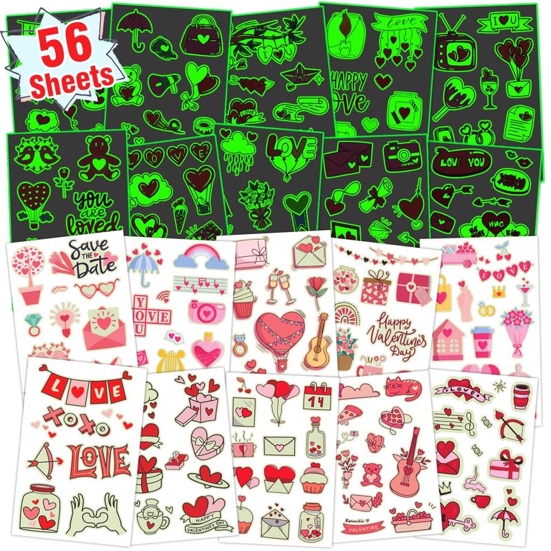 56 Sheets glow Valentines tattoos stickers for kids boys girls toddlers children.