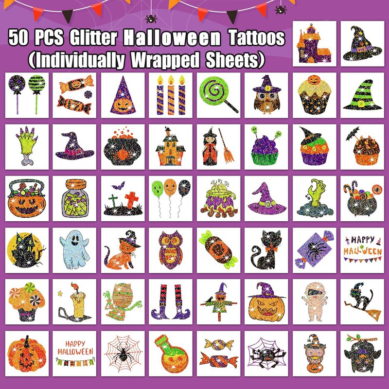 Partywind Glitter Halloween Party Supplies for Kids Treats, 50 Styles Kids Tattoos for Halloween Party Decorations Favors, Surprise Goodie Bag Stuffers for Boys Girls Halloween Birthday Party