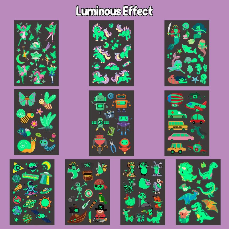 - 【Luminous Temporary Tattoos for Kids】Various series of luminous temporary tattoos for kids with unicorn, fairy, mermaid, dinosaur, construction theme, outer space theme, pirate, jungle animal and other bright patterns that kids will love. Perfect birthday gifts for kids!