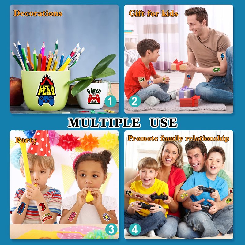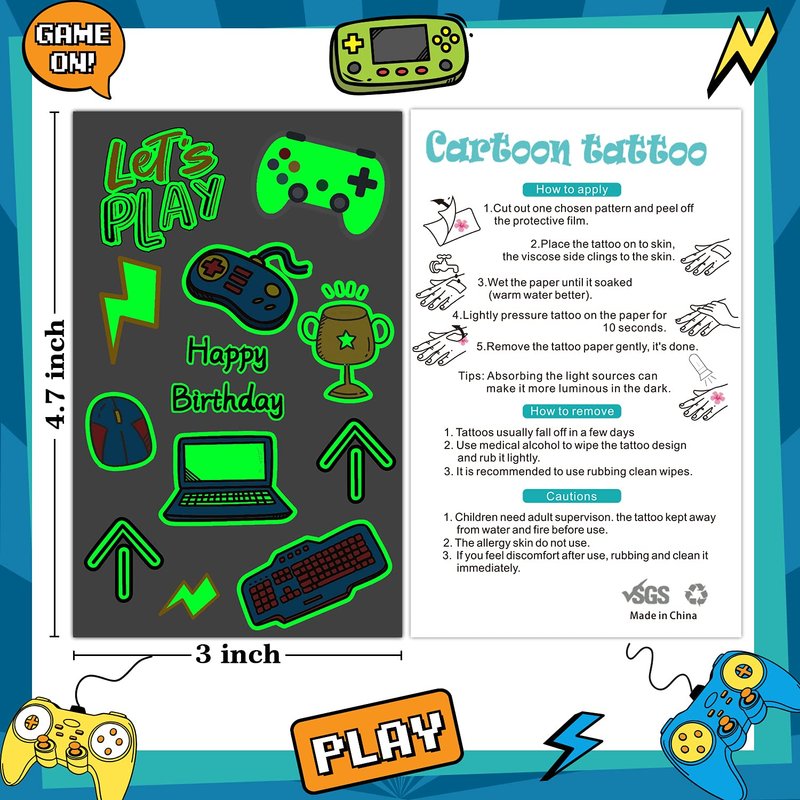- 【Applicable Place】These glow tattoo stickers are suitable for video game party supplies, gamer birthday decorations, gaming party favors. You can also apply them to your body or some smooth objects, such as glass, tile, water bottle, paper, stainless steel, plastic, mobile phone case and so on.