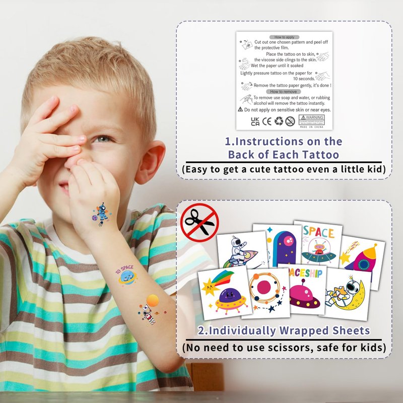 - 【Creative Space Party Supplies】These tattoos stickers are suitable for space party supplies, party favors, party decorations, goodie bag fillers, decor, games, toys, kids stocking stuffers, easter basket stuffers and so on. Suitable for boys, girls, baby, children.