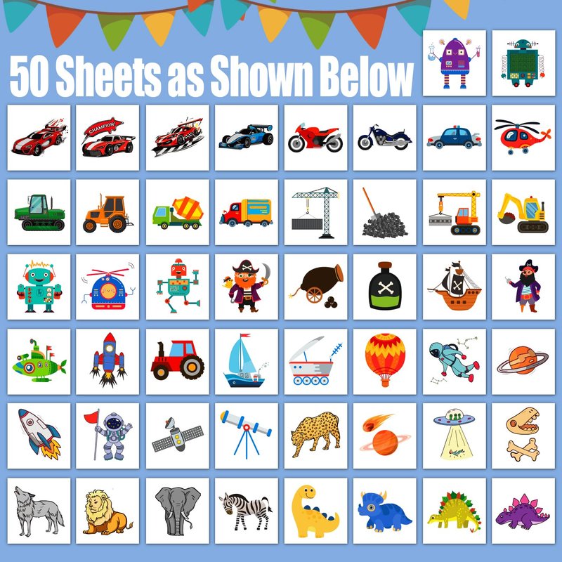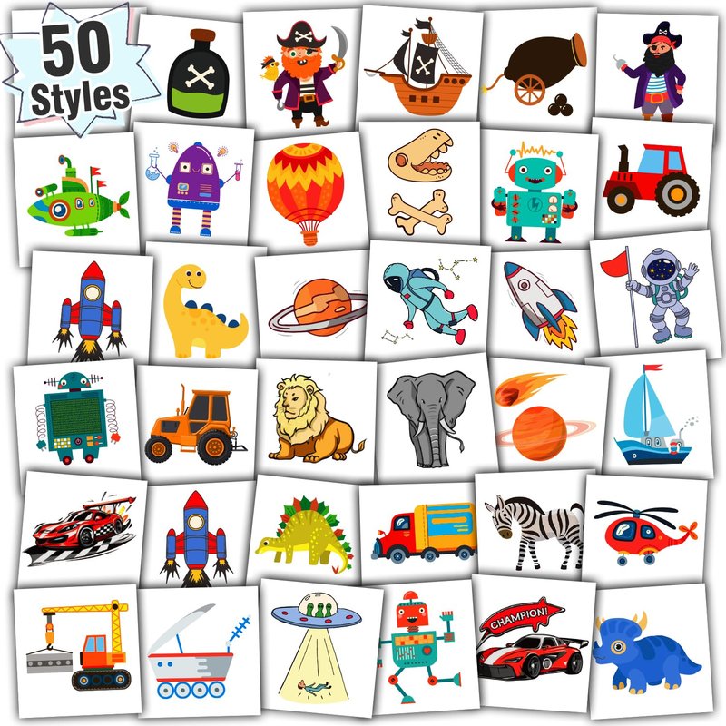- 【Great Value Temporary Tattoos for Boys】50 new styles include pirate, dinosaur, space, construction, truck, cars, tiger, lion, elephant, planet, etc. Special design for little boys! We can offer you the most stickers at a favorable price!