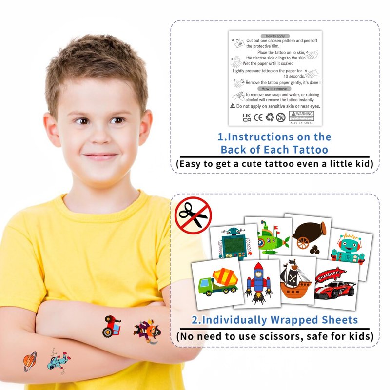 - 【Individually Cut Kids Tattoos】These tattoos are individually cut tattoos, they are easy to carry and can be distributed to kids individually. There are 50 different patterns in a set, which means that every child at the party can get 1 or more different tattoos. No need to use scissors and this keeps the children safe while they play.