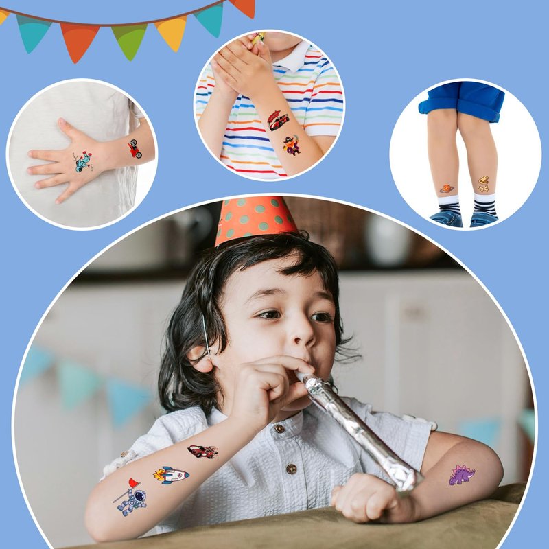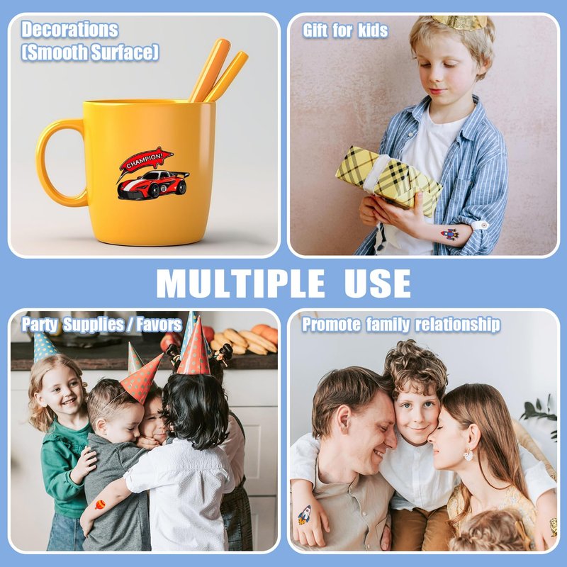 - 【Creative Birthday Party Favors】These tattoos stickers are suitable for boys party supplies, party favors, party decorations, birthday, games, goodie bag stuffers, etc. You can also apply them to some smooth objects, such as glass, tile, water bottle, stainless steel, plastic, etc.