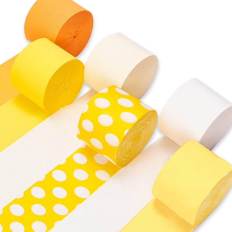 PartyWoo Crepe Paper Streamers 6 Rolls 492ft, Pack of Orange, Dot, Yellow, Pastel Yellow, Ivory and White Crepe Paper for Birthday Decorations, Baby Shower Decorations (1.8 Inch x 82 Ft/Roll)