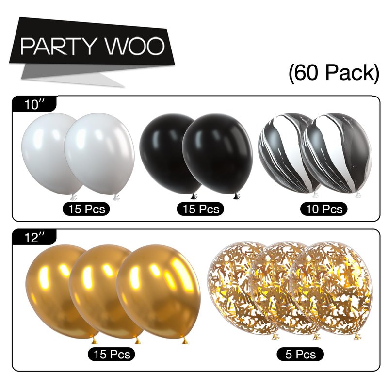 - 60 PCS WHITE GOLD BLACK BALLOONS: 10 inch pearl black balloons (15 pcs), 10 inch pearl white balloons (15 pcs); 10 inch black agate balloons (10 pcs), 12 inch gold metallic balloons (10 pcs), 12 inch gold confetti balloons (10 pcs). You can Control the amount of air inflated into each balloon to achieve your ideal color combination and balloon garland size