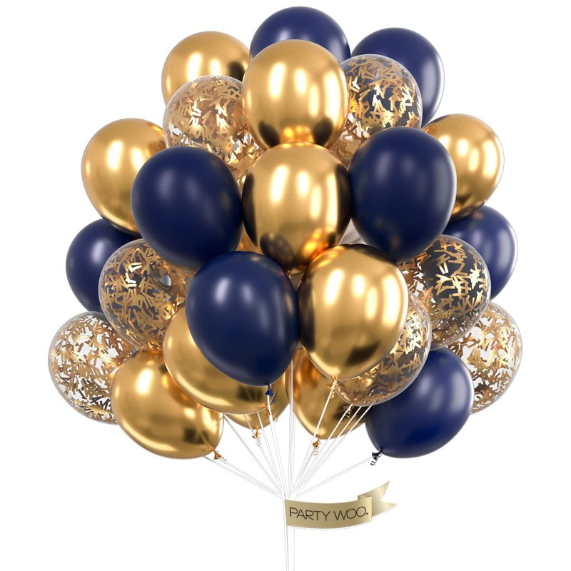- PACKAGE SPECIFICATION: 12 inch navy blue helium balloons (20 pcs), gold confetti balloons (10 pcs), 12 inch gold metallic balloons (10 pcs)