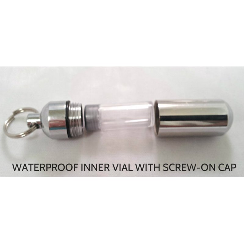 Sturdy, discreet, and secure, our anodized aluminum Cremation Urns are 1-3/4 inches tall and has a small clear vial inside to hold a small amount of your loved one's ashes. Keep them close to you always. The urn unscrews to reveal the storage chamber. Inside there is a clear vial to keep the ashes safe and dry. A rubber gasket on the screw-on cap provides a waterproof seal. Strong and lightweight enough to carry every day. They can be attached to a keychain, or you can hang them on a car mirror, a framed-photo of your loved one, your favorite necklace, or anywhere that will bring you comfort.