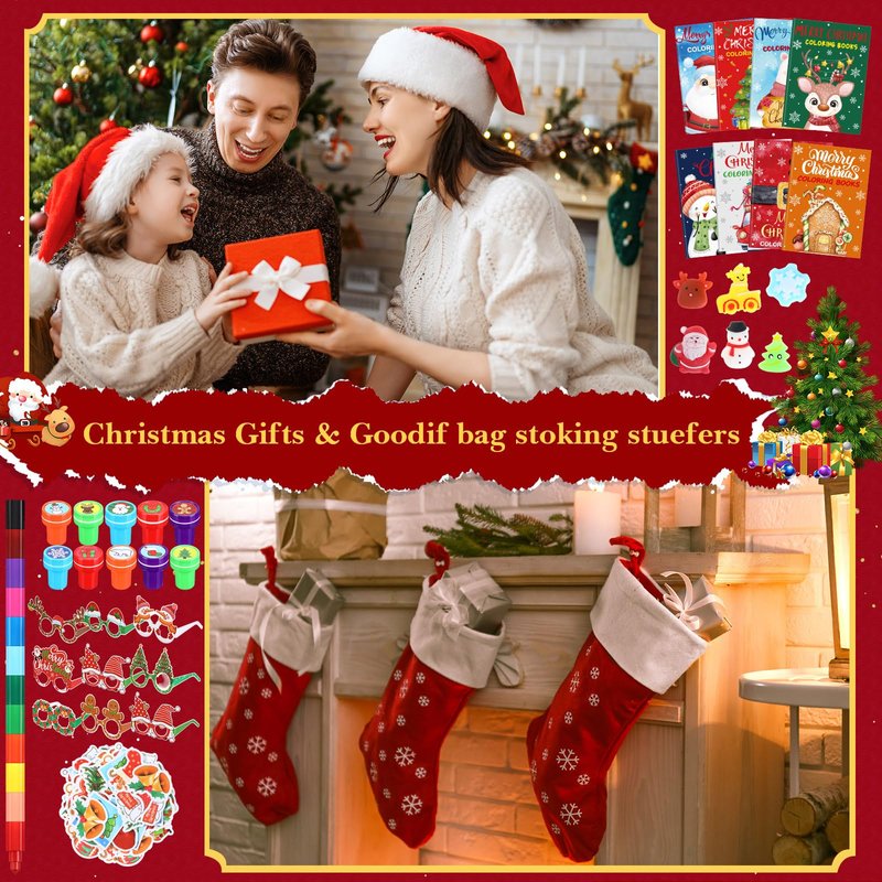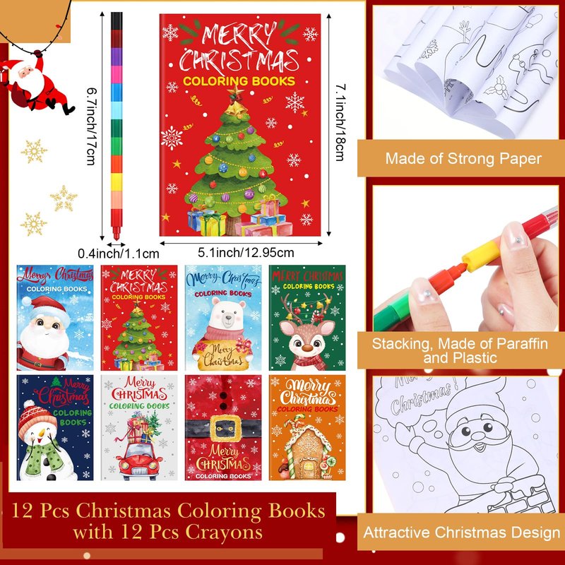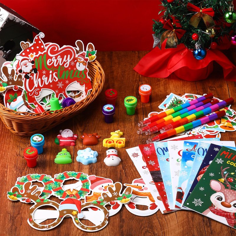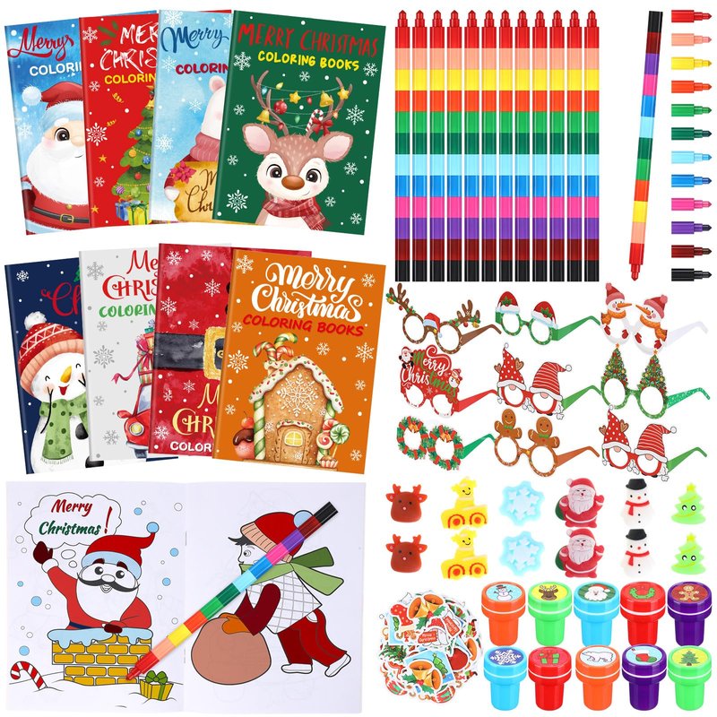 - Christmas Mini Gifts Set: this 12 set Christmas holiday party favors is a collection of 12 pcs bulk Christmas mini coloring books, 12 pcs Christmas crayons, 12 pcs stress relief items, 12 pcs stamps, 12 pcs Christmas paper glasses and 50 pcs Xmas stickers that make nice Christmas bulk gifts for group gatherings