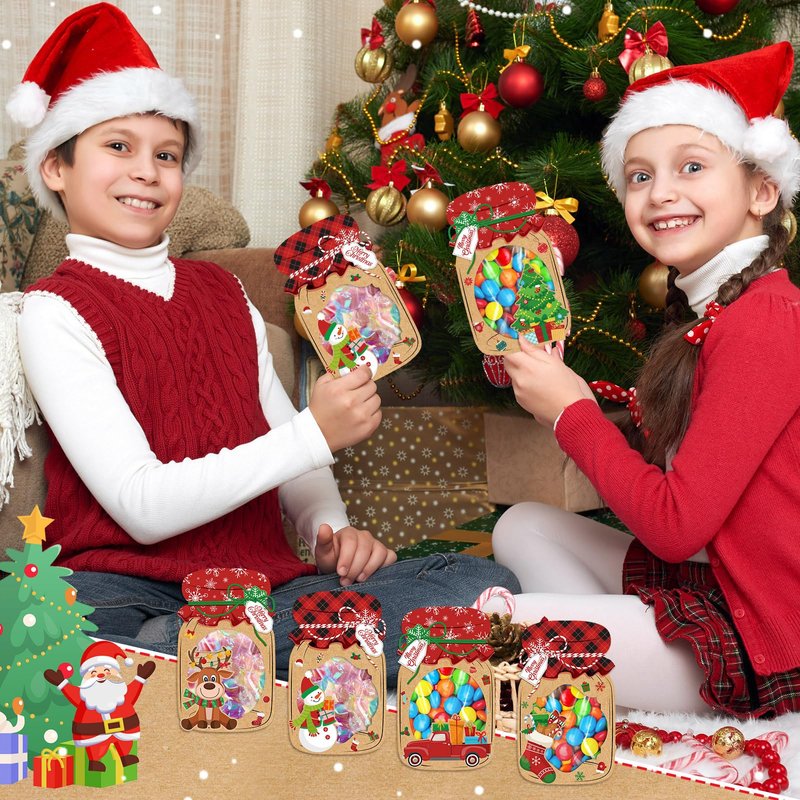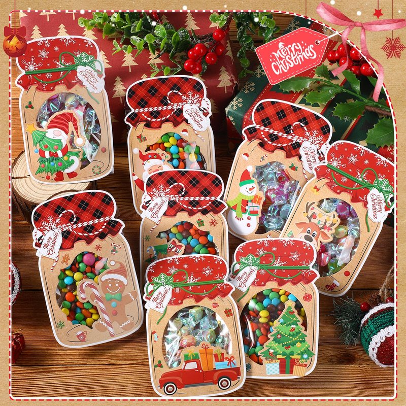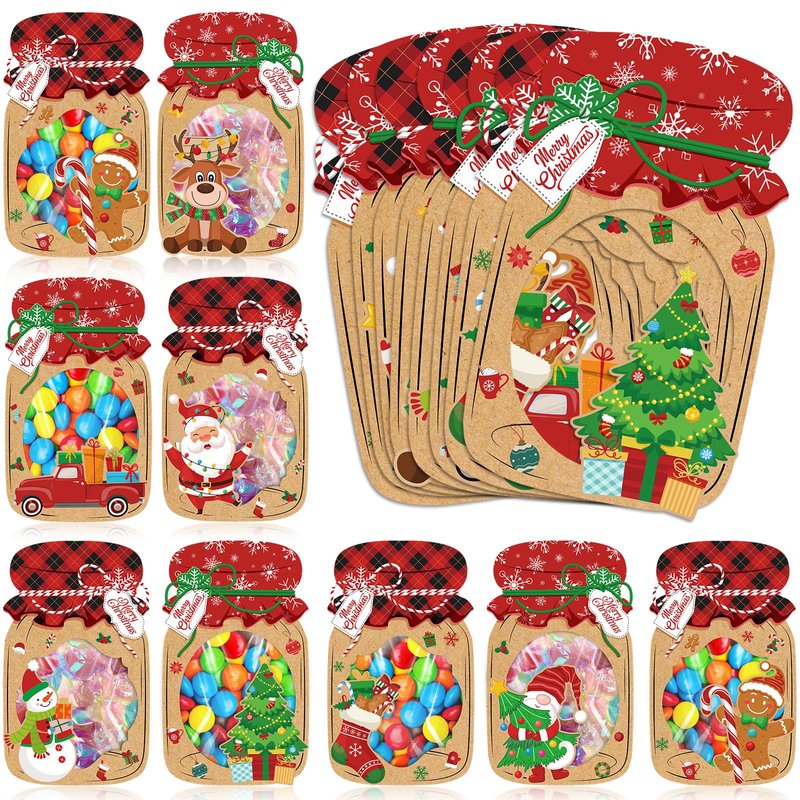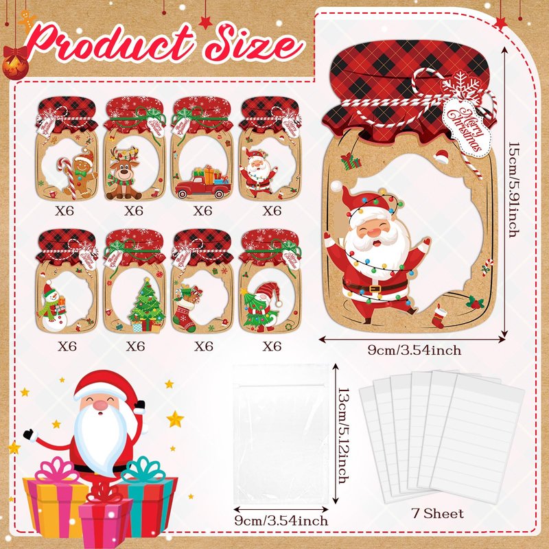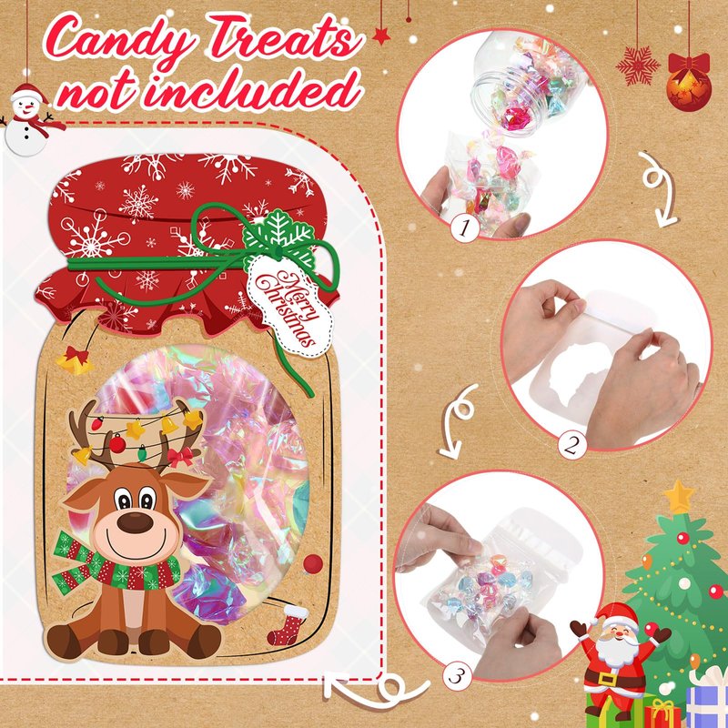 - Christmas Treat Bags Craft Kits: our mason jar Christmas cards set includes 48 pcs paper cards in 8 designs, 48 transparent sealed Stand up goodie bags and 7 sheets double-sided glues, so you can DIY each card with different styles; Please note sweets are not included