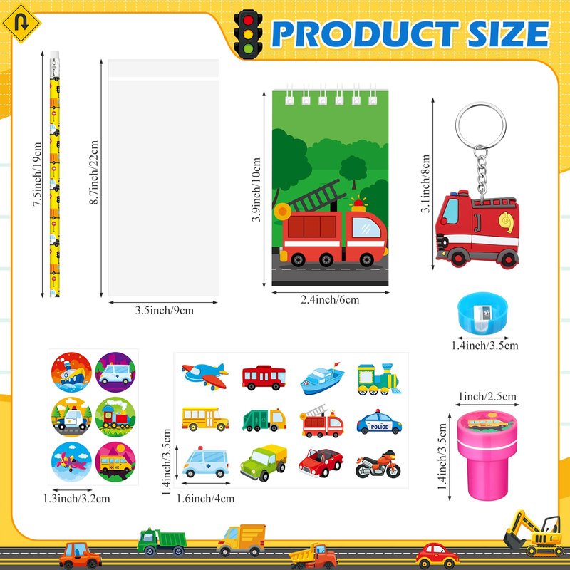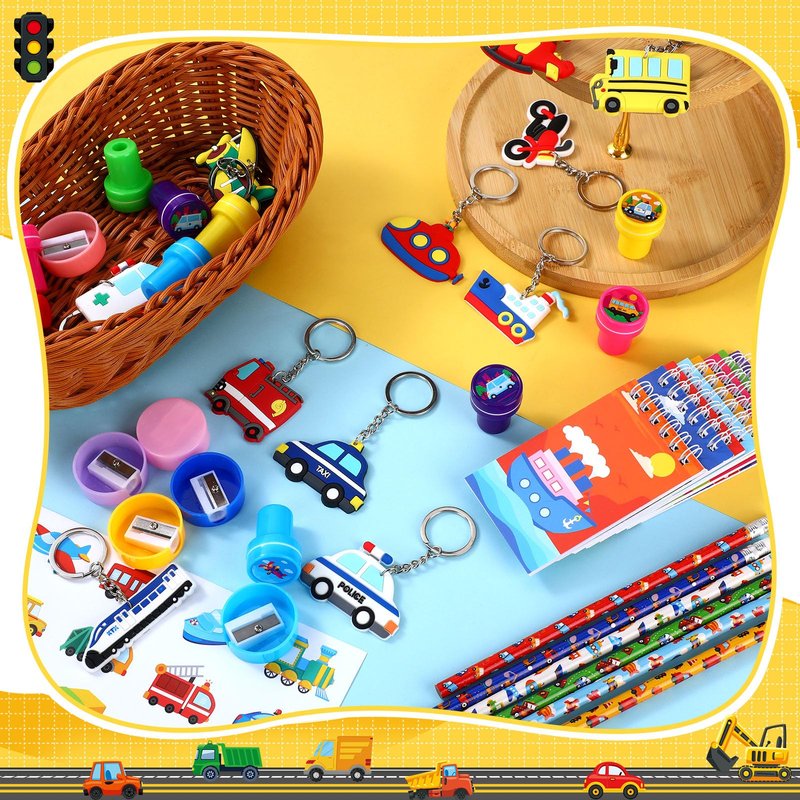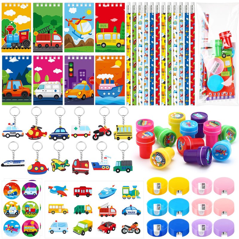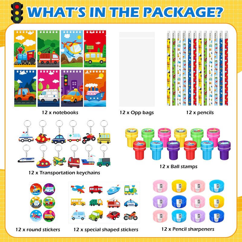 - Package Includes: our transportation stationery party favors include 12 key chains, 12 pencils, 12 notebooks, 12 pencil sharpeners, 12 round stickers, 12 pens, 12 colorful stickers and 12 stamps; The quantity is sufficient to meet your daily use and party favors needs, you can share our transportation party favors with friends and family