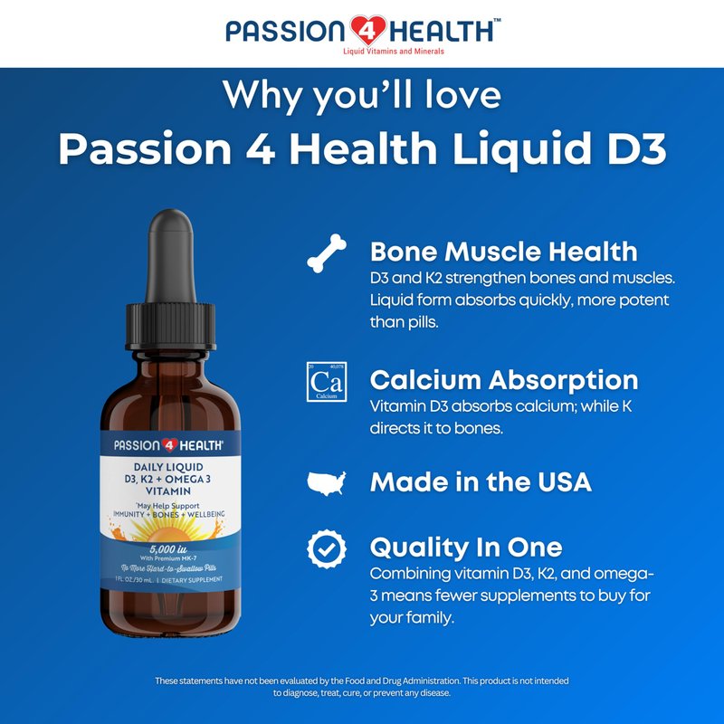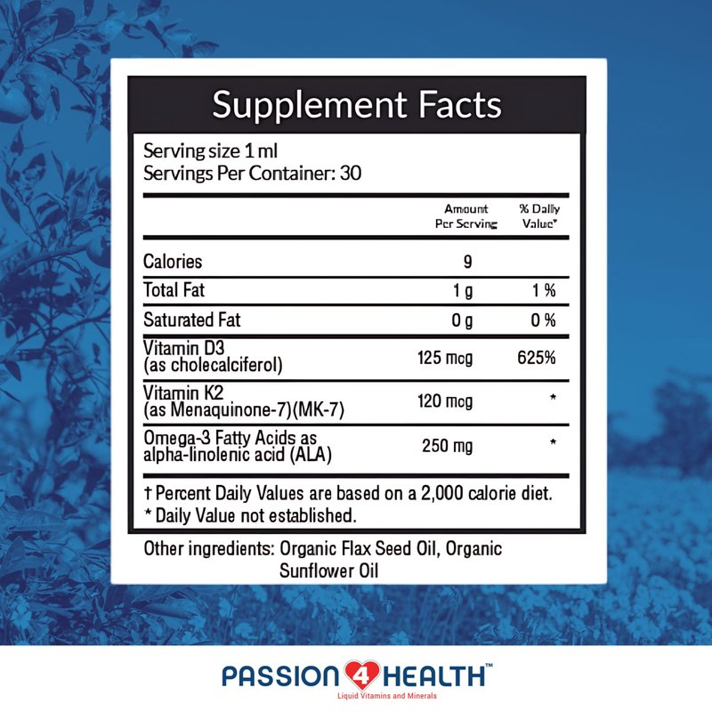 - Passion 4 Health Makes Healthy Living Easy: Powerful combination of vitamin D3, K2, and omega-3 means less supplements you have to buy for your family. Pairs well with our Passion 4 Life Liquid Multivitamin.