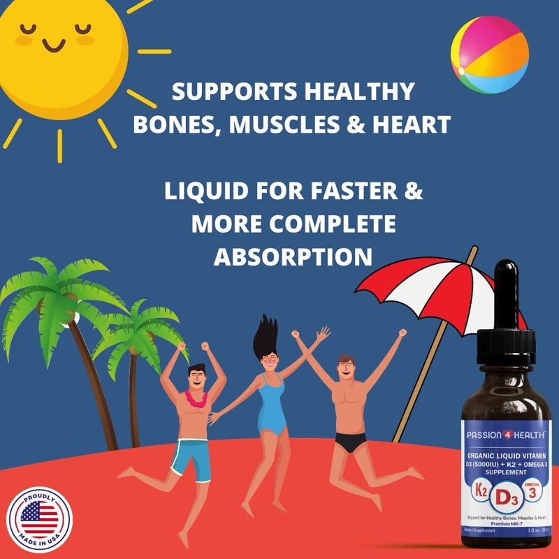 Passion 4 Health Organic Liquid Vitamin D3 (5000IU) + K2 (Mk-7) + Omega 3 Supplement - Support for Healthy Bones and Muscles (1)