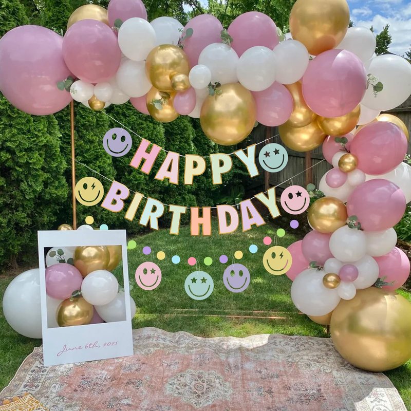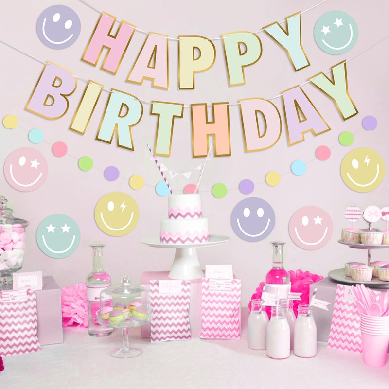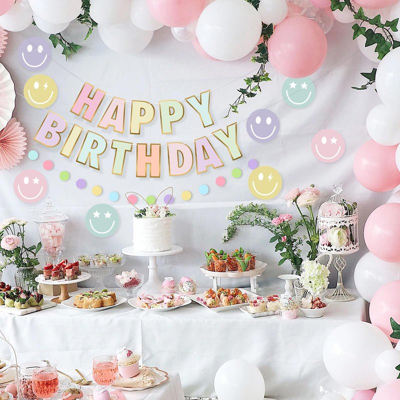 - Vibrant Design: Our macaron happy birthday banner features pastel letters. The package includes a burst of girls birthday decorations. The smiley face and circle dots birthday garland adds a hint of glamour to the overall design. These unique birthday decorations will brighten up your birthday party.