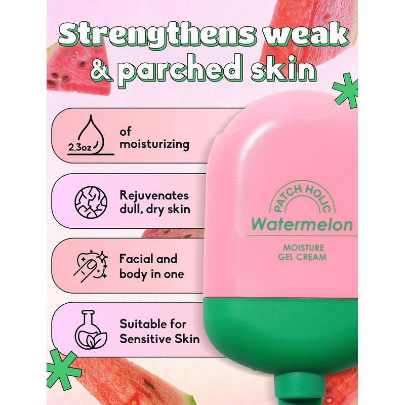 Introducing PATCH HOLIC Watermelon Moisture Gel Cream, the ultimate facial moisturizer for sensitive skin. This Korean skincare moisturizer is specifically designed to provide deep hydration and nourishment for dry & sensitive skin. Infused with watermelon extract, it delivers a cool and refreshing burst of moisture, leaving your skin feeling revitalized and rejuvenated. The hyaluronic acid cream formula ensures a non-sticky texture, making it a perfect dry face moisturizer for those who dislike heavy or greasy products.