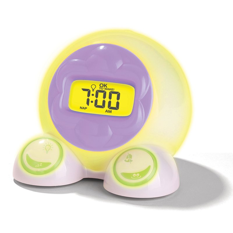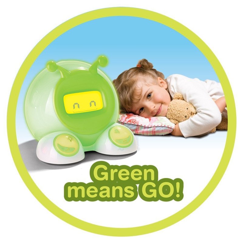- 4.5" bedside clock with soft yellow night-light glows green when it's OK for your child to get out of bed