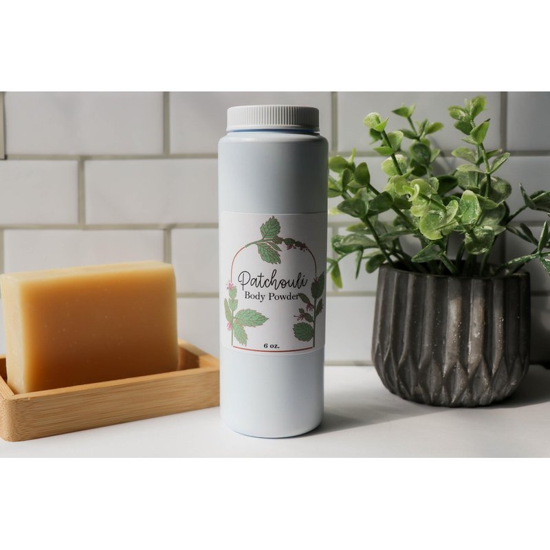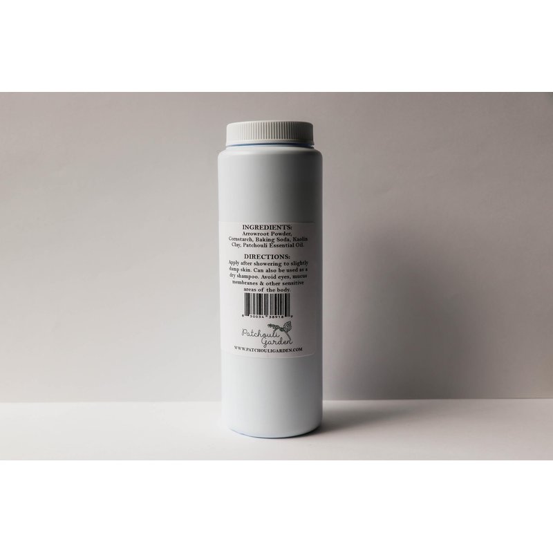 - Ingredients: Arrowroot Powder, Cornstarch, Baking Soda, Kaolin Clay, Patchouli Essential Oil.