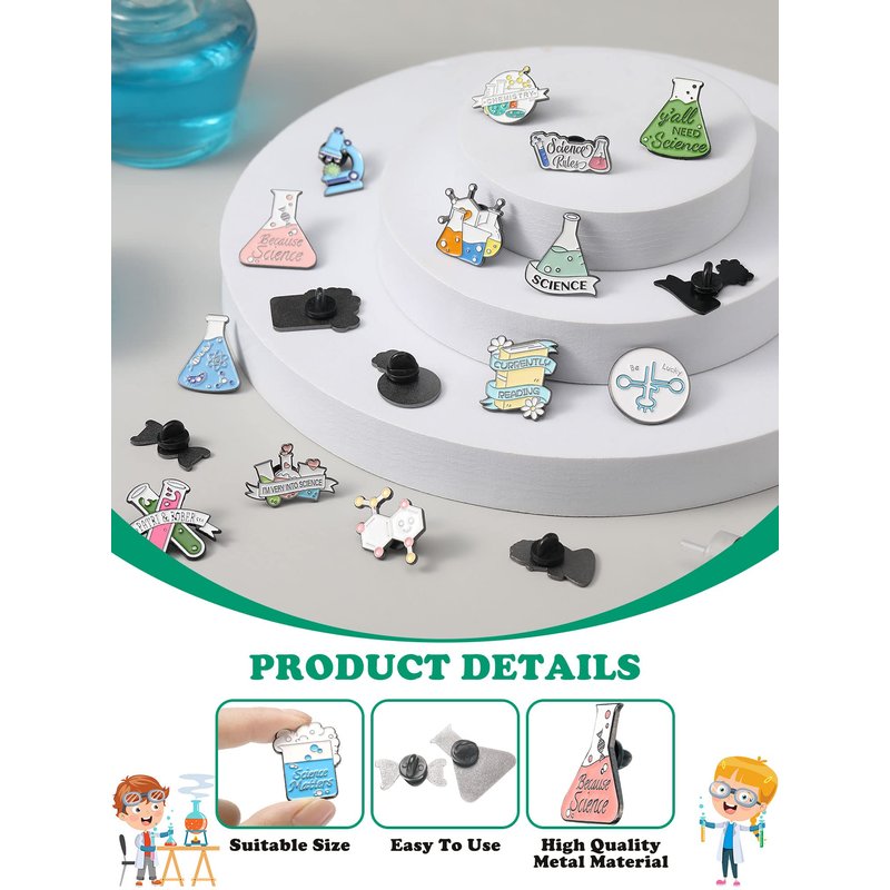 - Interesting Lab Elements: the laboratory enamel pin set features various patterns, including book, tube, Erlenmeyer, microscope and more, which can arouse students' interest in chemistry and science