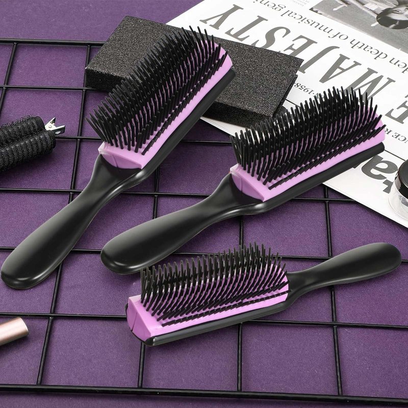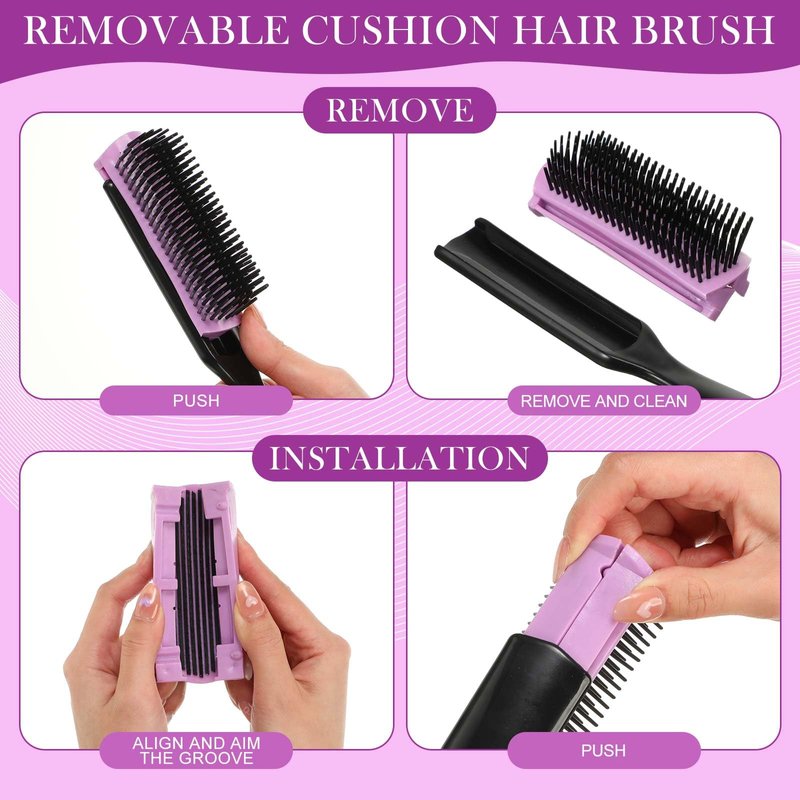 Features: Suiting different hair styles: Our 9-row and 5-row detangler nylon combs are suitable for people no matter what kind of hair styles they have at most ages, long or short, straight or curly, fine or thick, which help clean and tidy hair. Easy to take: The cushion hairbrush is lightweight and portable, and you can put it in your backpack and suitcase when you are on vacation, business trip and more, does not occupy much space, easy and handy. Specifications: Size: Around 8.3 x 1.4 inch/ 21 x 3.5 cm, 7.7 x 1.2 inch/ 19.5 x 3 cm, 6.1 x 1 inch/ 15.5 x 2.5 cmMaterial: nylon (brush head)Color: purple bush head and black handleTotal: 3 piecesPackage content: 3 x Removable hair brushesWarm tips: 1. Please allow slight size differences due to different manual measurement. 2. Product pointed part included, please keep it away from little children. 3. The colors may have slight differences due to different screens.