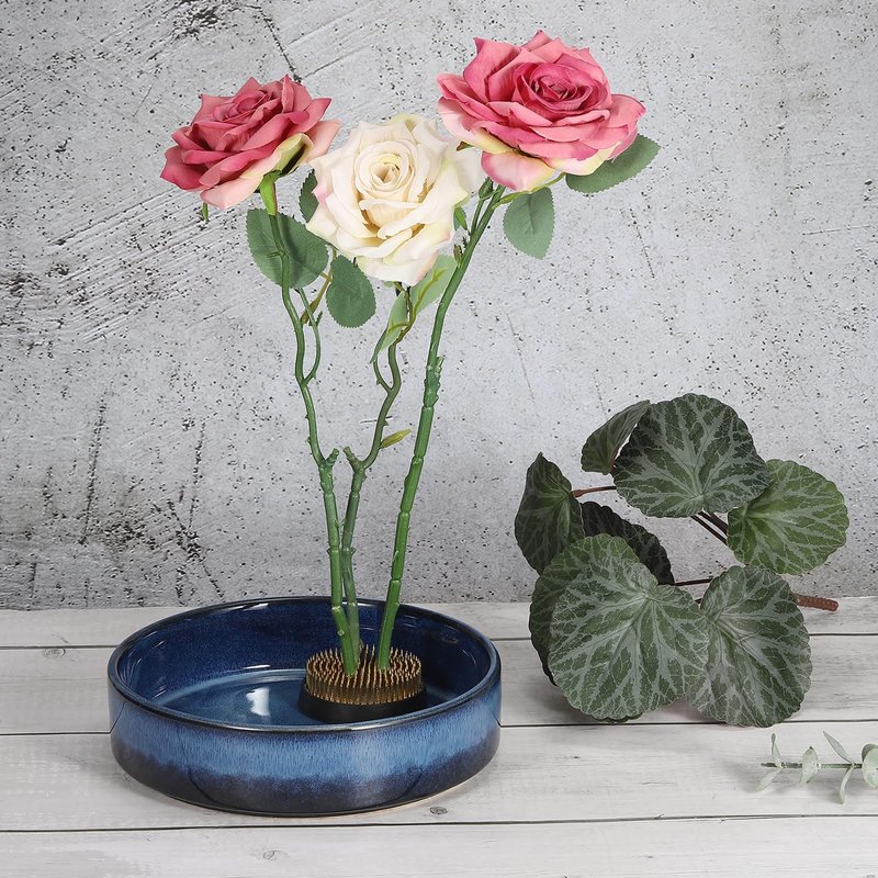 - Instruction: Trim the flower stems to fit the flower-arranging device, insert the bottom stem into the flower-arranging device's needle, and place it in the vase.