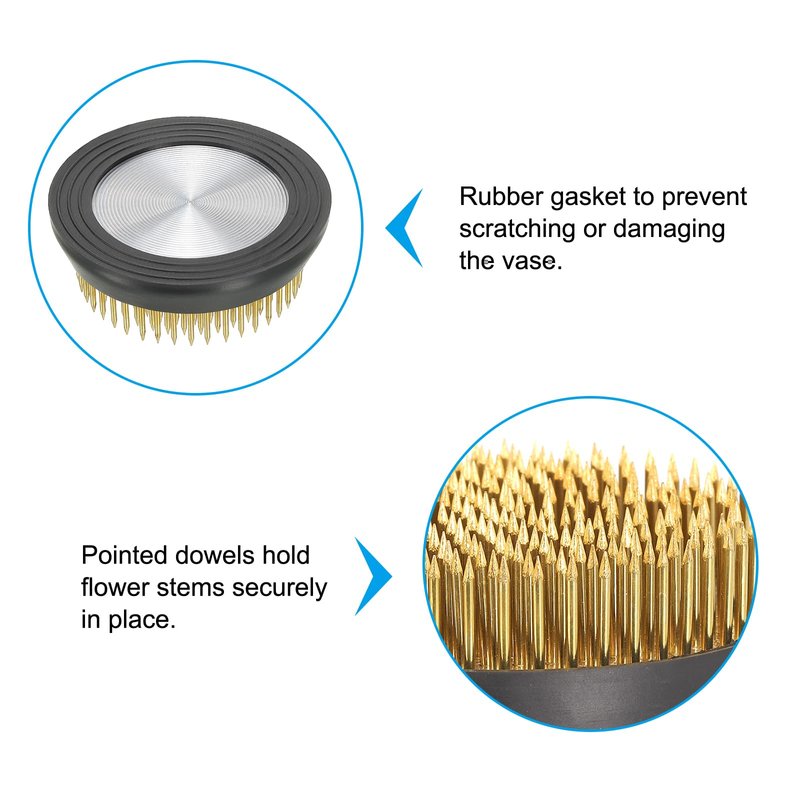 - Advantage: 1. The flower frog flower arranger is made of durable brass and features a metal base to ensure stability and longevity. 2. Pointed dowels hold the stems securely in place, allowing you to create beautiful and eye-catching arrangements.
