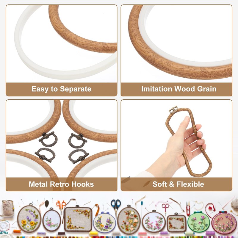 - Durable Material: Our cross stitch hoop frame is made of PVC plastic, durable and flexible, with good compression resistance, the outer resin hoop has good elasticity and can be easily twisted into an "8" shape to return to its initial shape. Retro brass hanging ring with wood grain makes handcrafts more exquisite, anti-skid texture offers a comfortable grip.