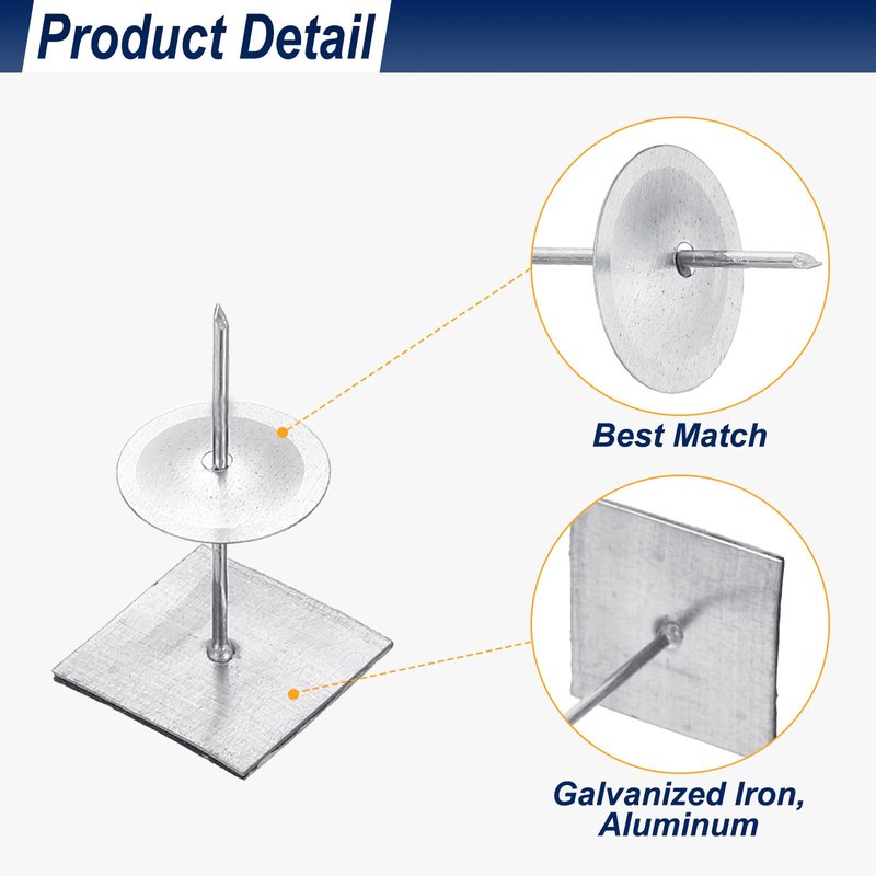 - Function - The base of the insulation pin is self-adhesive,it allows you to fix insulation panels easily and conveniently. Metal point makes the nail easy to penetrate into different insulation materials and the washers can help you fix the insulation board in position better.