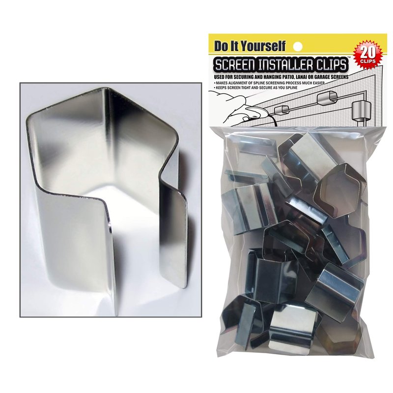 - The "Original" Screen Installer Clips: This package contains 20 Screen Installer Clips that will assist you with installing and fixing Window/Door Screens. This makes the process much easier and makes this a 1 person job. The Screen Installer Clips will save you time and effort when installing patio, lanai, porch , window, door, and garage screens. Recommended to use with Plastic Screen Rollers to avoid rips!