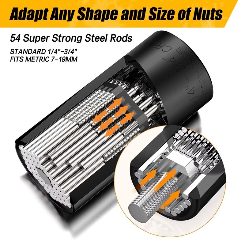 - High-quality Stainless Steel - We used 54 super strong steel rods, individually spring-driven, allowing the socket to instantly adapt to any shape and size of nuts and bolts as well as offering a guarantee of durability and no slipping. It's a high-quality tool that you can see and feel!