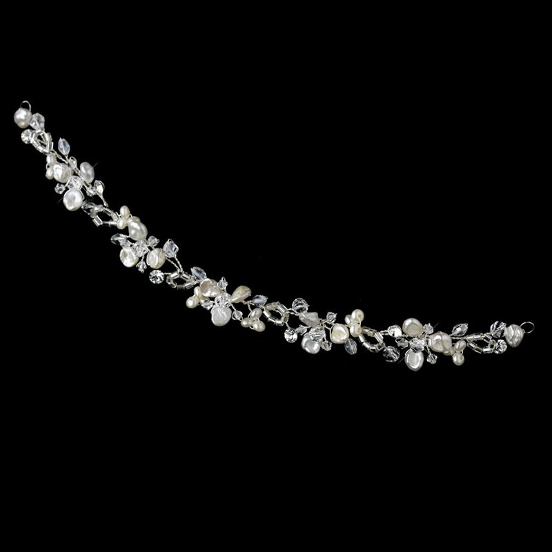 A charming flexible hair band weave that features wonder freshwater pearls, Swarovski crystals, clear rhinestones and bugle beads accents in a wonderful setting. Scattered along the band, this headpiece is a lovely hair accessory for any given occasions. Size: 8.5" (Length) .75" (Width)