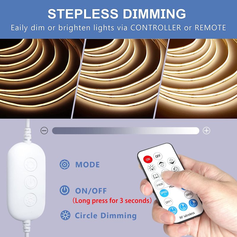 - STANDARD KIT: Each light kit comes with a 16.4ft bright warm white DC24V self-adhesive COB strip light roll, a power adapter(24V/2A),a 17-Key RF Remote and a 3-Button control box for dimming