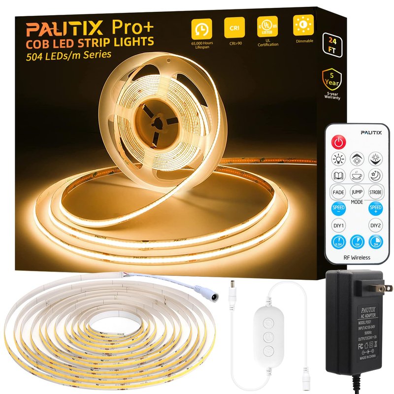 - SUPER BRIGHT & LONGER LENGTH: Never heard of COB LED Strip Light?A COB(Chip On Board) LED light has multiple chips on the PCB (Printed Circuit Board) than SMD Type,3780 LEDs on this 24.6ft/7.5m COB LED Strip Lights(504LEDs/m),which creates super even lighting performance,NO DARK SPOTS! 2700K color temperature,you'll enjoy an incredibly bright illumination with improved color quality