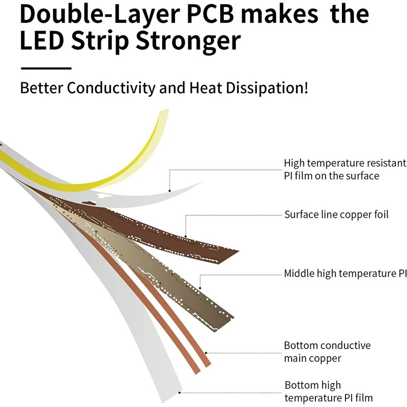 - 【Ultra Bright & Longer Length】2772 LEDs on this 18ft/5.5m COB LED Strip Lights(504LEDs/M),which make the emitting units unprecedentedly close to each other, and create super even lighting performance.Compared to the SMD 2835: 1 chip on board, or 5050: 3 chips on board,a COB(Chip On Board) LED light has multiple chips on the same PCB (Printed Circuit Board)