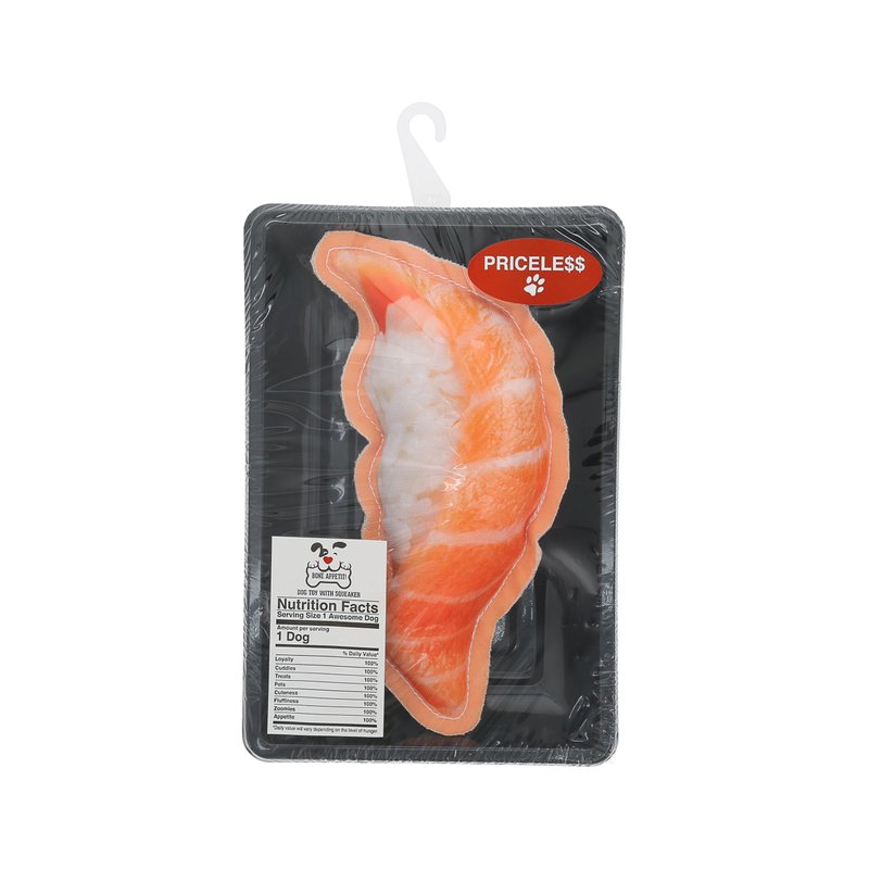 - PREMIUM QUALITY: This 7.5" tall, 3.5" long & 1" wide realistic sushi dog toy is made from durable materials—polyester and natural cotton. The edges of the toy have a weathered rustic look. The fluffed-up polyester fiber-filled center with white stitching shapes contains a single plastic squeaker with a branded tag below on the backside.