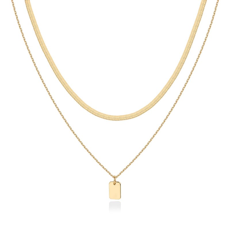 - PAVOI Women's 14k gold plated double layered necklace comes with a dog tag pendant and herringbone chain. A dainty, minimalist design that you can wear wherever you go, from day to night.