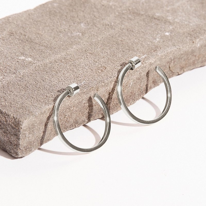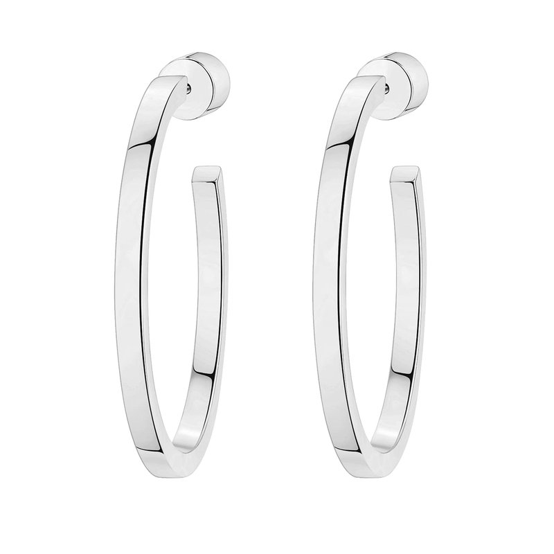 - These beautiful square edge large open hoops are plated in Rhodium, and feature an open design. The post is stainless steel, making them hypoallergenic.