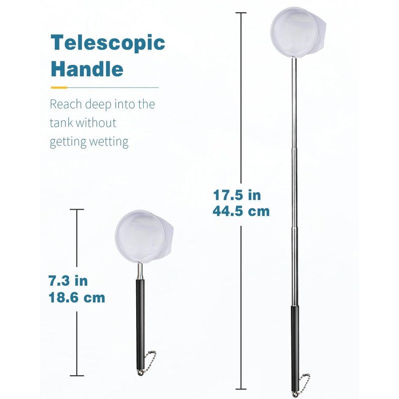 - Telescopic Handle: The stainless steel handle is 5.3 inches long when closed and 15.5 inches long when extended. The rod is stiff and uneasy to get bent or rusty. Easily reach deep into the tank without getting wetting.