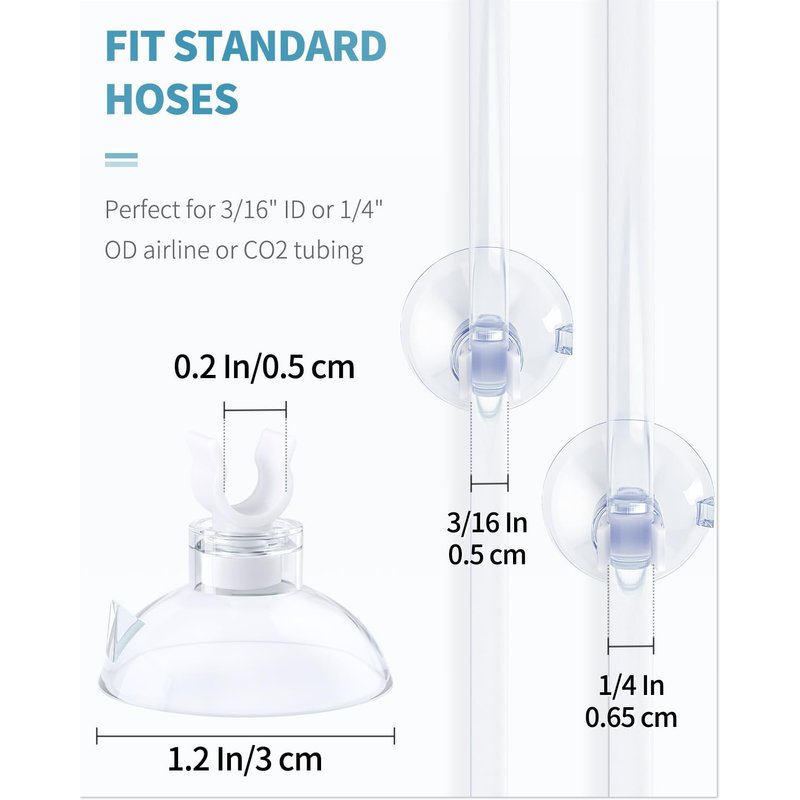 - For Standard Hoses: Each suction cup is 1.2" in diameter with a 0.2" clip. Perfect for holding standard 3/16" ID or 1/4" OD aquarium airline tubing or CO2 tubing.