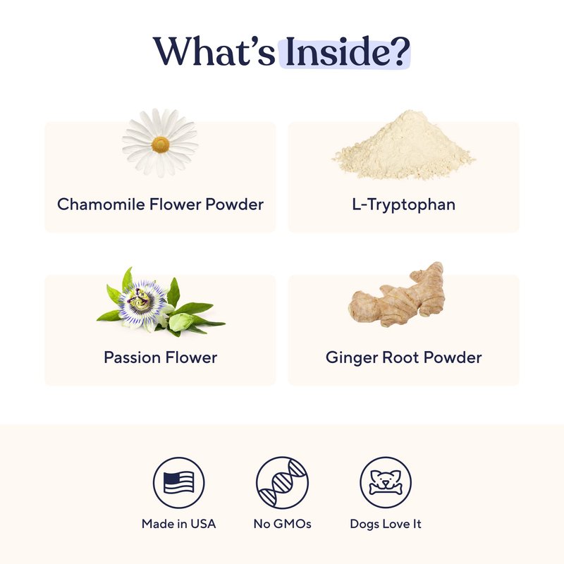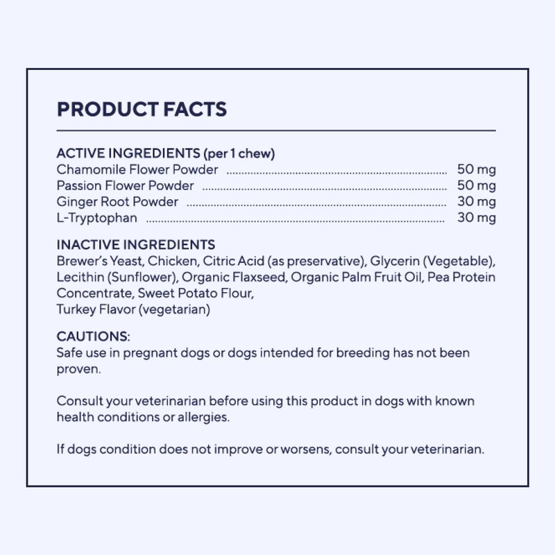 These tasty turkey flavored chews allow you to help ease your dog’s behavior in a natural, gentle and effective way. - Ease stress, anxiety and anger in dogs - Natural muscle relaxant for tense muscles - Helps to ease upset stomachs and bowel issues - Calm separation anxiety and balance overall mood