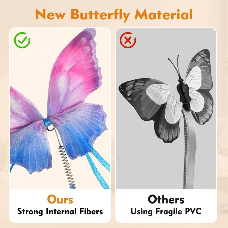 - 【Hunting Simulation & Entertaining Exercise】 Our 360-degree self-rotation butterfly wand caters to the natural hunting instinct of kittens. The newly designed spring-loaded rod is sturdy and built to last. Hide and seek feathers keep cats mentally and physically healthy and provide the satisfaction of capturing prey. The moving track balls entertain cats safely and provide independent exercise, allowing them to play, bat, kick, and pounce.